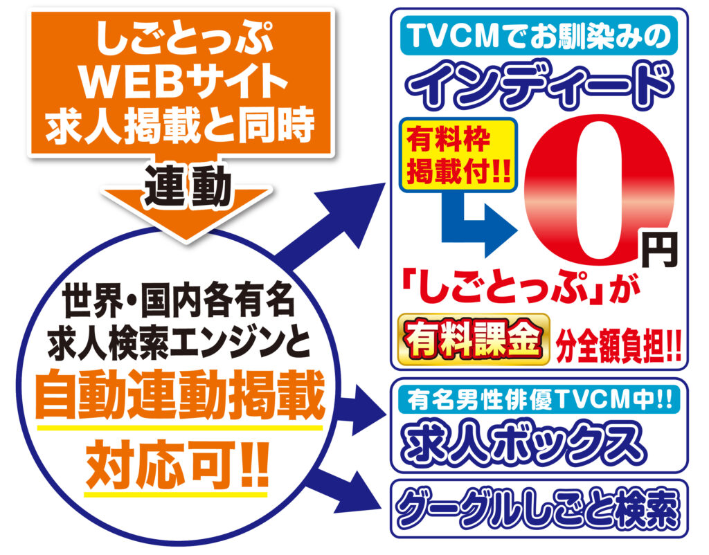 日本全国掲載可。しごとっぷWEBサイト掲載と同時に世界・国内各有名求人検索エンジンと自動連動掲載対応可。
